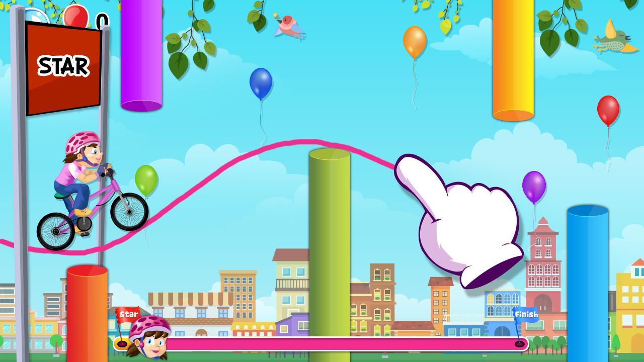 - 손가락을 화면에 넣어 아기 자전거를 타는 길을 그리십시오. 장애물을 피하십시오.